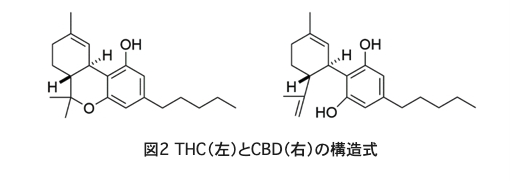 「カンナビス・サティバ・エル」は約120種類が報告されていますが、「カンナビノイド」と呼ばれる独特な化合物群を含んでいます。その代表的なものがΔ9-テトラヒドロカンナビノール(THC)やカンナビジオール(CBD)で、それぞれ下のような構造をしています。