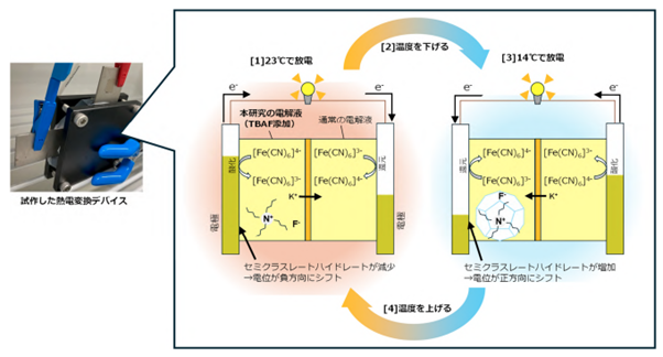 この新しい電解液を使用して試作された熱電変換デバイスでは、14℃〜23℃程度の小さな温度変化によって、繰り返し発電することができます。
