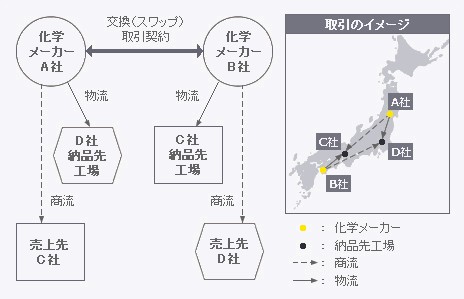 交換(スワップ)取引のなかには、ロケーション・スワップがあります。例えば、A社の売上先がC社、B社の売上先がD社である場合で、A社にとってはD社の納品先工場の方が、B社にとってはC社の納品先工場の方が相互に近距離である場合に、A社とB社が相互に納品先を交換する契約を締結することがあります。このような契約により、各社は相互に物流費を削減することができます(下図参照)。