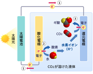太陽光を照射して生成された水素イオンをCO₂と反応させ、ギ酸を合成することで、電池としてエネルギーを効率的に貯蔵・利用できる仕組みが実現できます。