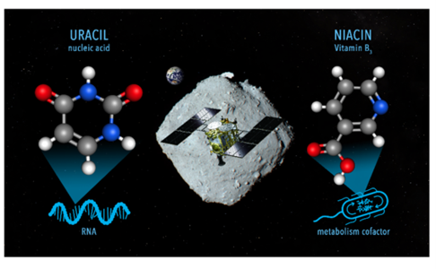 その中には、すべての地球生命のRNAに含まれる核酸塩基「ウラシル」と、生命の代謝に必要不可欠な「ビタミンB₃(ナイアシン)」が含まれていました。