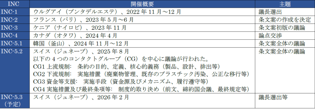 2022年3月の第5回国連環境総会(UNEA-5.2)決議に基づき、プラスチック汚染対策に関する法的拘束力のある国際文書(以下、「条約」とする)の策定が進められており、政府間交渉委員会(Intergovernmental Negotiating Committee:INC)にて議論が進められている2。INCは2022年11月より開催され、当初は2024年末までの作業完了を目指していたが、交渉の難航によりスケジュールは延長され、2025年8月のINC-5再開会合(INC-5.2)まで議論が継続したものの、最終的に合意には至らなかった。2026年2月には新たなINC議長選出のためにINC-5.3が予定されているが、ここでは体制の調整が主題とされており、最終合意にはいまだ時間を要する見込みである。INC開催概要は表1のとおり。