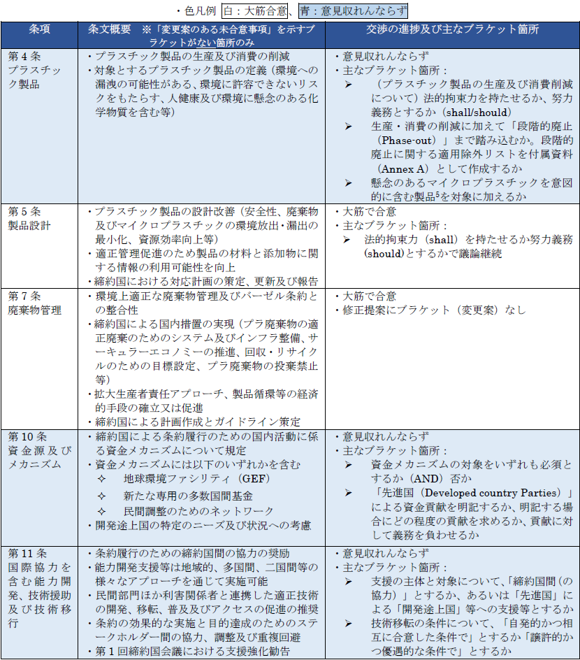 INC5.2の報告書案によれば残念ながら「進展が不十分であり」、「いくつかの条項においては共通理解に向けた進展がほとんどみられない」結果となった3。しかし、手続き規定の一部の条項については合意に向けた進捗があり、2025年8月15日に議長より提示された修正提案(Chair’s Revised Text Proposal)にて、「変更案のある未合意箇所」を示すブラケットがない記載となっている4。具体的には、複数の手続き規定において意見合意し法的な手続きの段階に移ったほか、一定の合意が得られた、または最終化に向けた議論が進展している条項として「第5条 製品設計」や「第7条 廃棄物管理」等がある。反対に、意見の収れんに至らず、合意に更なる時間を要するのは「第4条 プラスチック製品」等であった(表2)。