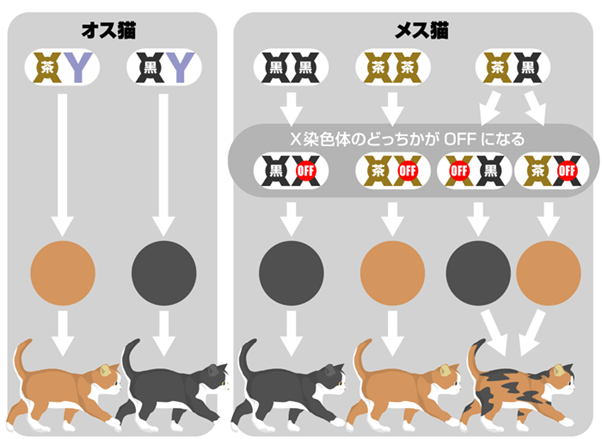 メス猫の場合、親から受け継いだ2本のX染色体のうち片方だけが機能し、もう片方は不活化されています。