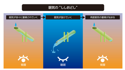 眠気自体は、覚醒している時間とともに徐々に蓄積され、一定のレベルに達すると入眠し、そして眠ると解消される、まるで「ししおどし」のようなシンプルな仕組みになっています。