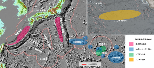 経済産業省の計画によれば、これまで計7つの鉱床で概略資源量5,180万5,000トンが把握され、さらに沖縄や伊豆・小笠原の海域で新たに7つの鉱床が見つかっています。